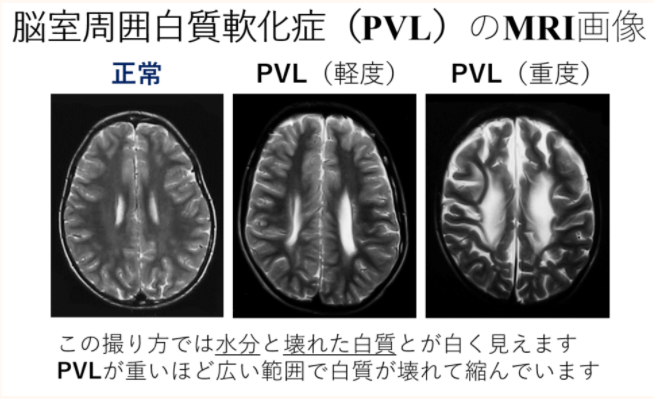 PVL(脳室周囲白質軟化症):脳の「脳室周囲白質」という所が出生前に何かしらの原因で虚血状態(赤ちゃんの脳に酸素や血液がうまく行かない状態)になり、局所的に壊死してしまう疾患。