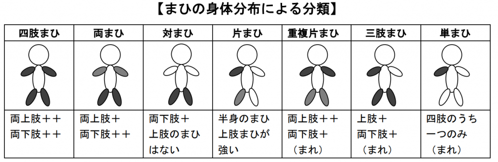私は「痙直型(けいちょくがた)」にあたり、麻痺の出現する身体箇所の分布としては「四肢麻痺」あるいは「両麻痺」にあたる。
